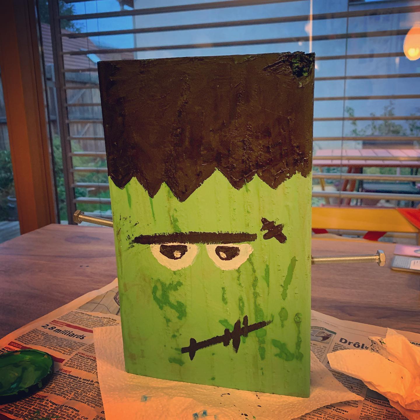 Un vieux bout de planche, 2 vieilles vis et hop, un Frankenstein pour notre déco d’Halloween #DIY #Halloween